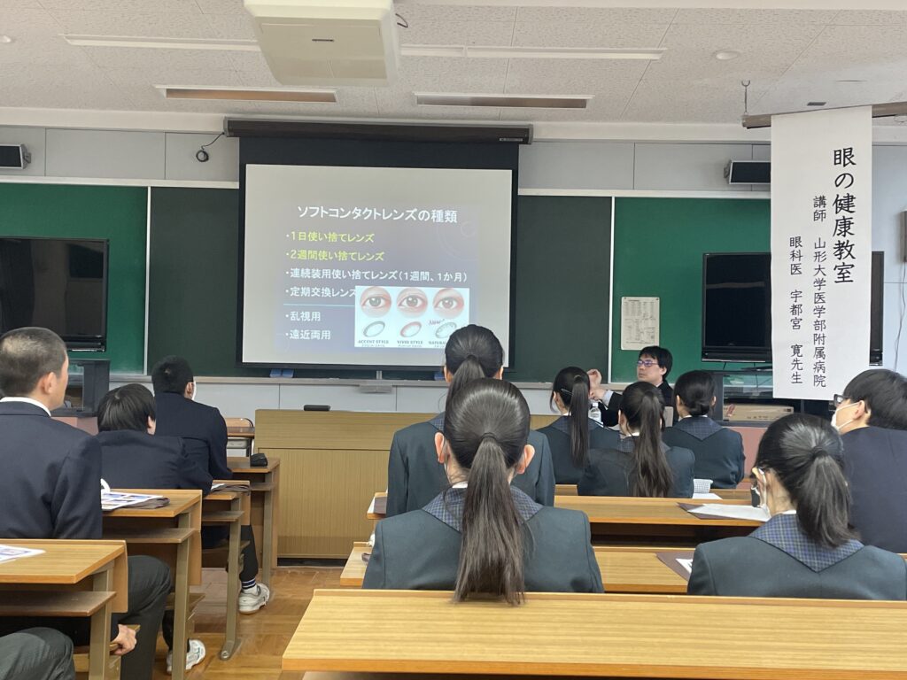 学校生活 2025.12.04 アイバンク医学講座 12月3日(水)、特進コース1年生を対象にアイバンク医学講座が開催されました👨🏫 山形大学医学部附属病院眼科医の宇都宮寛先生をお招きし、眼の構造や角膜移植の仕組み、そしてアイバンクの役割についてご講演いただきました。 角膜提供の大切さや視力を支える医療への理解が深まり、生徒にとって有意義な学習の機会となりました。