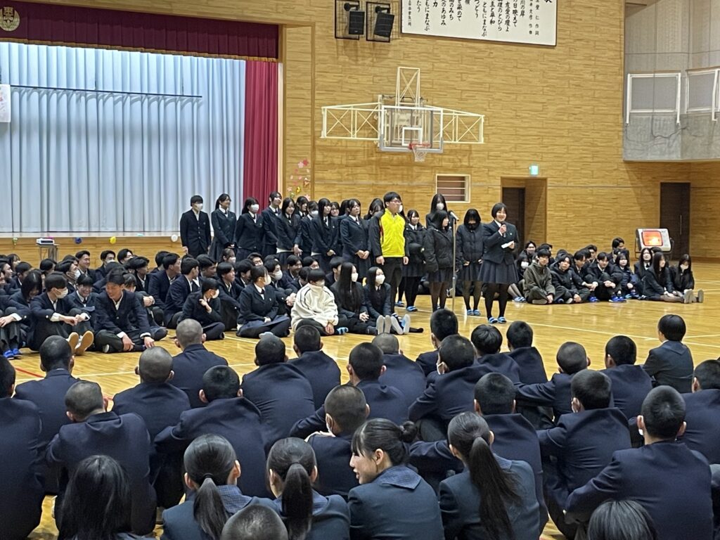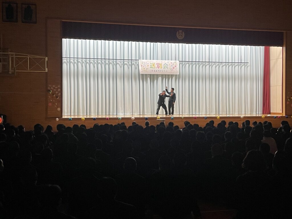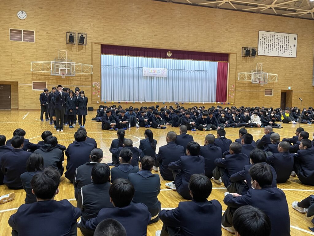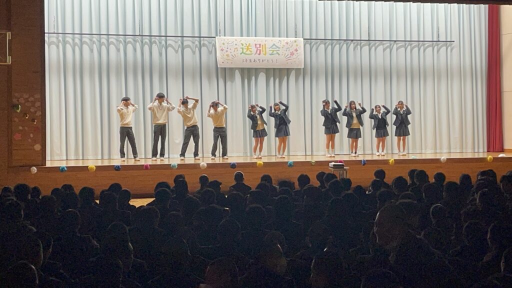 学校生活 2026.03.02 送別会 2月26日(木)、卒業を控えた3年生のために送別会が行われました。各部活動が工夫をこらした出し物で会場は大盛り上がり!! 笑い声や大きな拍手があふれ、終始にぎやかで楽しい時間となりました。 3年生からの挨拶では、これまでの感謝の言葉が語られ、思い出に残る素敵な送別会となりました。