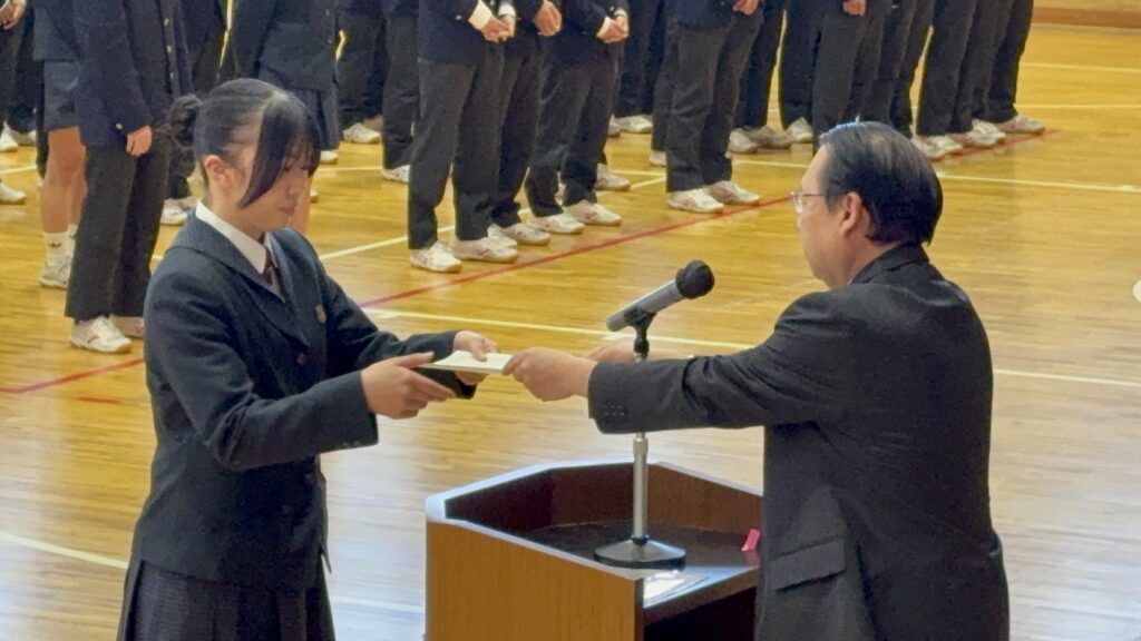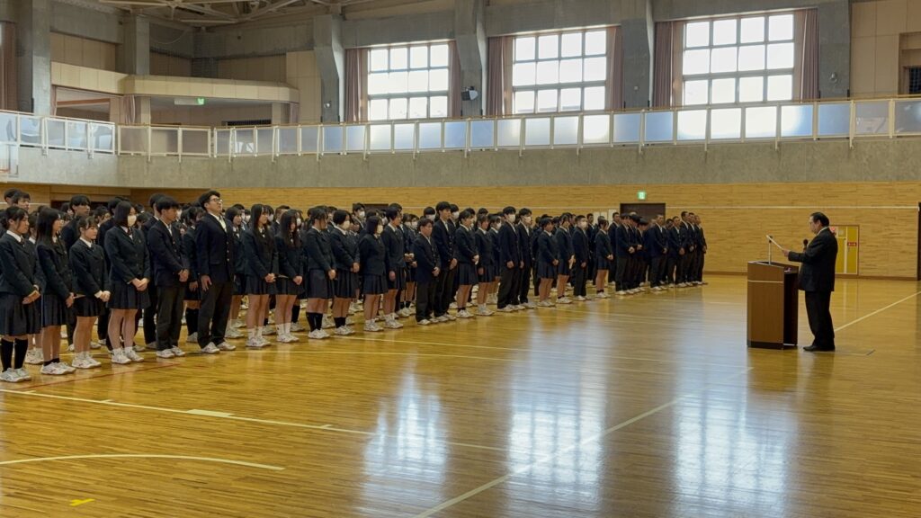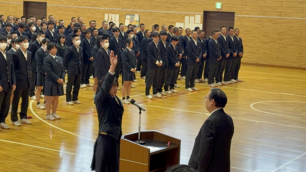 学校生活 2026.04.17 サポート特待生認定式 鶴岡東高校は、がんばる生徒を応援する「サポート特待生」の制度があります。4月13日(月)その特待生となる生徒たち428名の認定式が行われました。代表として女子卓球部主将・竹内美桜さんが校長先生から認定書を授与され、宣誓しました。特待生として自覚と誇りをもって、今後も文武両道に励んでいってください。
