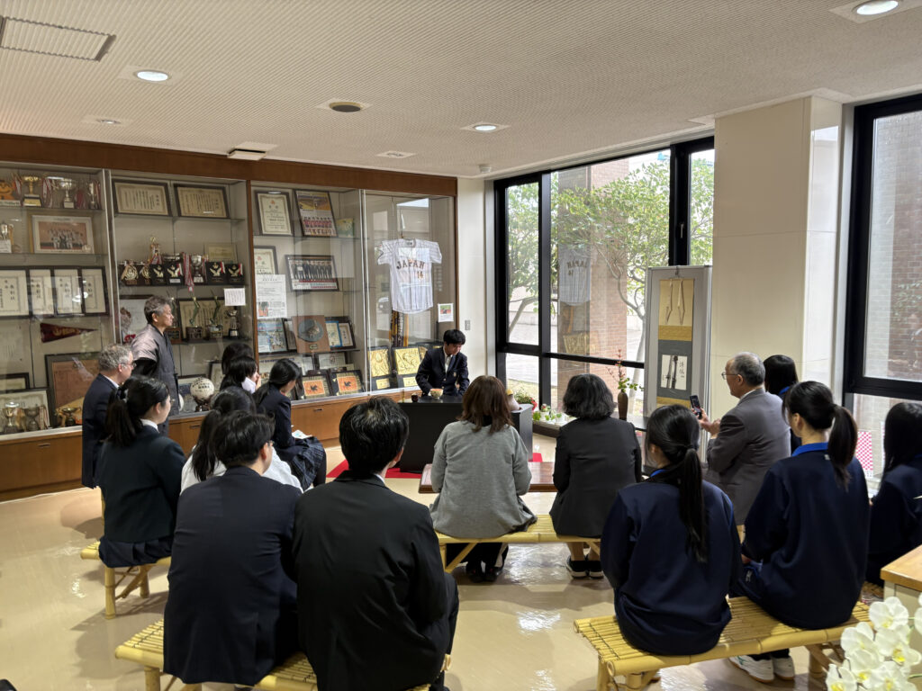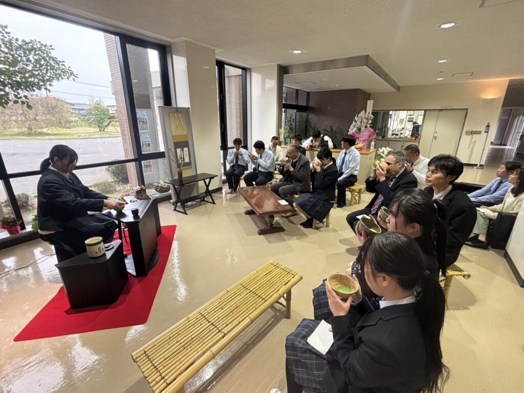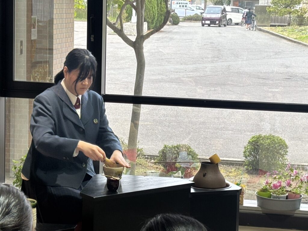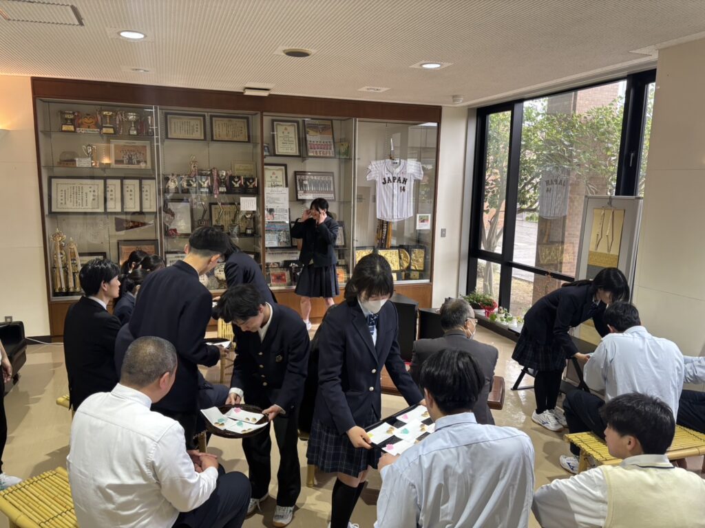部活動 2026.04.28 茶道部 新入生歓迎春茶会 4月23日(木)放課後、茶道部が主催する春茶会が行われました。多くの生徒・教職員がお茶とお菓子を楽しみました。お菓子は地元のお菓子屋さんから購入しているそうです。また茶道部の新入部員がお運びに挑戦し、先輩方から教わる様子も見られました。